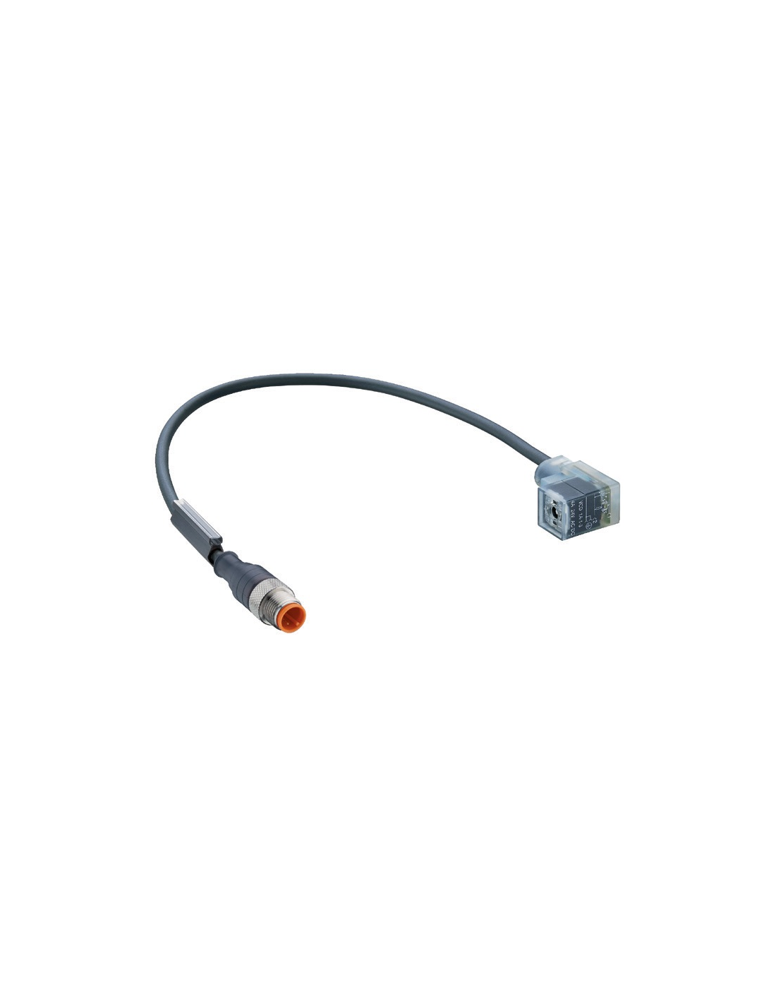 Type: RST 5-3-VCD 1A-1-3-241/2 M Description: Actuator cordset, double-ended, M12 male connector with self-locking threaded joint and valve connector according to DIN EN 175301-803, form C (8.0 mm), 3 poles, varistor voltage protection (LED yellow), PUR jacket, halogen free, orange, 2 meters.